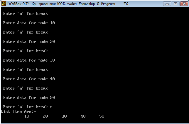 /* CREATING CIRCULAR HEADER LINKED LIST */ #include<stdio.h> #include<conio.h> #include<stdlib.h> struct link { int data; struct link *next; }; int i=0; struct link *node,*start; void create_link(struct link *node) { char ch; start->next=NULL; node=start; fflush(stdin); printf("\n Enter 'n' for break:"); ch=getchar(); while(ch!='n') { node->next=(struct link *)malloc(sizeof(struct link)); node=node->next; printf("\n Enter data for node:"); scanf("%d",&node->data); node->next=start; fflush(stdin); printf("\n Enter 'n' for break:"); ch=getchar(); i++; } } void display(struct link *node) { int count; node=start->next; count=i; while(count) { printf("\t %d",node->data); node=node->next; count--; } } void main() { char ch; clrscr(); create_link(node); printf("List Item Are:-\n"); display(node); getch(); }
