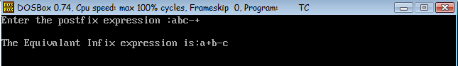 #include <stdio.h> #include <stdlib.h> int top = 10; struct node { char ch; struct node *next; struct node *prev; } *stack[11]; typedef struct node node; void push(node *str) { if (top <= 0) printf("Stack is Full "); else { stack[top] = str; top--; } } node *pop() { node *exp; if (top >= 10) printf("Stack is Empty "); else exp = stack[++top]; return exp; } void convert(char exp[]) { node *op1, *op2; node *temp; int i; for (i=0;exp[i]!='\0';i++) if (exp[i] >= 'a'&& exp[i] <= 'z'|| exp[i] >= 'A' && exp[i] <= 'Z') { temp = (node*)malloc(sizeof(node)); temp->ch = exp[i]; temp->next = NULL; temp->prev = NULL; push(temp); } else if (exp[i] == '+' || exp[i] == '-' || exp[i] == '*' || exp[i] == '/' || exp[i] == '^') { op1 = pop(); op2 = pop(); temp = (node*)malloc(sizeof(node)); temp->ch = exp[i]; temp->next = op1; temp->prev = op2; push(temp); } } void display(node *temp) { if (temp != NULL) { display(temp->prev); printf("%c", temp->ch); display(temp->next); } } void main() { char exp[50]; clrscr(); printf("Enter the postfix expression :"); scanf("%s", exp); convert(exp); printf("\nThe Equivalant Infix expression is:"); display(pop()); printf("\n\n"); getch(); }