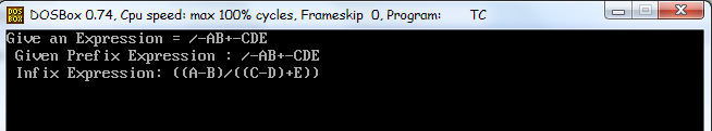 #include <string.h> #include <ctype.h> #include <conio.h> char opnds[50][80],oprs[50]; int topr=-1,topd=-1; pushd(char *opnd) { strcpy(opnds[++topd],opnd); } char *popd() { return(opnds[topd--]); } pushr(char opr) { oprs[++topr]=opr; } char popr() { return(oprs[topr--]); } int empty(int t) { if( t == 0) return(1); return(0); } void main() { char prfx[50],ch,str[50],opnd1[50],opnd2[50],opr[2]; int i=0,k=0,opndcnt=0; clrscr(); printf("Give an Expression = "); gets(prfx); printf(" Given Prefix Expression : %s\n",prfx); while( (ch=prfx[i++]) != '\0') { if(isalnum(ch)) { str[0]=ch; str[1]='\0'; pushd(str); opndcnt++; if(opndcnt >= 2) { strcpy(opnd2,popd()); strcpy(opnd1,popd()); strcpy(str,"("); strcat(str,opnd1); ch=popr(); opr[0]=ch;opr[1]='\0'; strcat(str,opr); strcat(str,opnd2); strcat(str,")"); pushd(str); opndcnt-=1; } } else { pushr(ch); if(opndcnt==1)opndcnt=0; /* operator followed by single operand*/ } } if(!empty(topd)) { strcpy(opnd2,popd()); strcpy(opnd1,popd()); strcpy(str,"("); strcat(str,opnd1); ch=popr(); opr[0]=ch;opr[1]='\0'; strcat(str,opr); strcat(str,opnd2); strcat(str,")"); pushd(str); } printf(" Infix Expression: "); puts(opnds[topd]); getch(); }