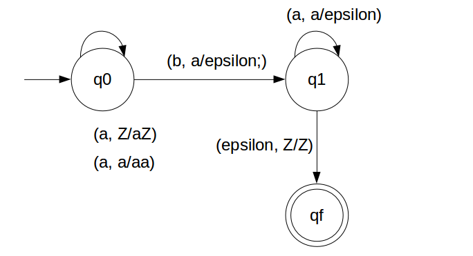 δ(q0, a, Z) = (q0, aZ) δ(q0, a, a) = (q0, aa) δ(q0, b, a) = (q1, ε) δ(q1, b, a) = (q1, ε) δ(q1, ε, Z) = (qf, Z)