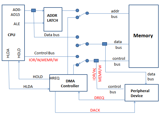 - The DMA controller temporarily borrows the address bus, data bus and control bus from the microprocessor and transfers the data directly from the external devices to a series of memory locations (and vice versa).