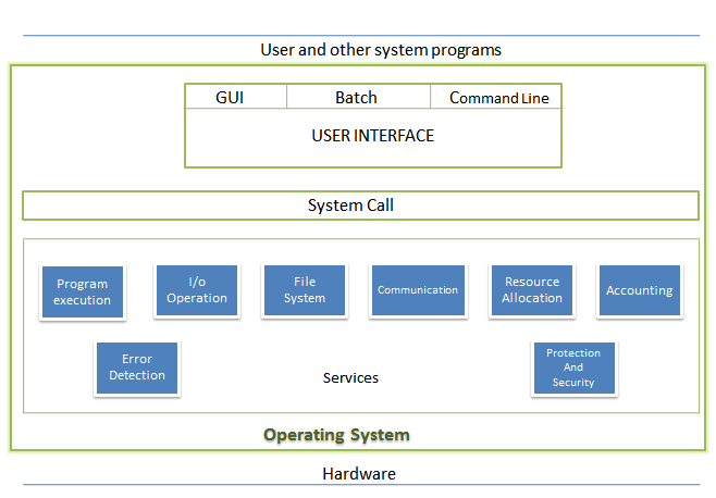 - User interface -Almost all operating systems have a user interface (UI),Varies between Command-Line (CLI), Graphics User Interface (GUI), Batch
